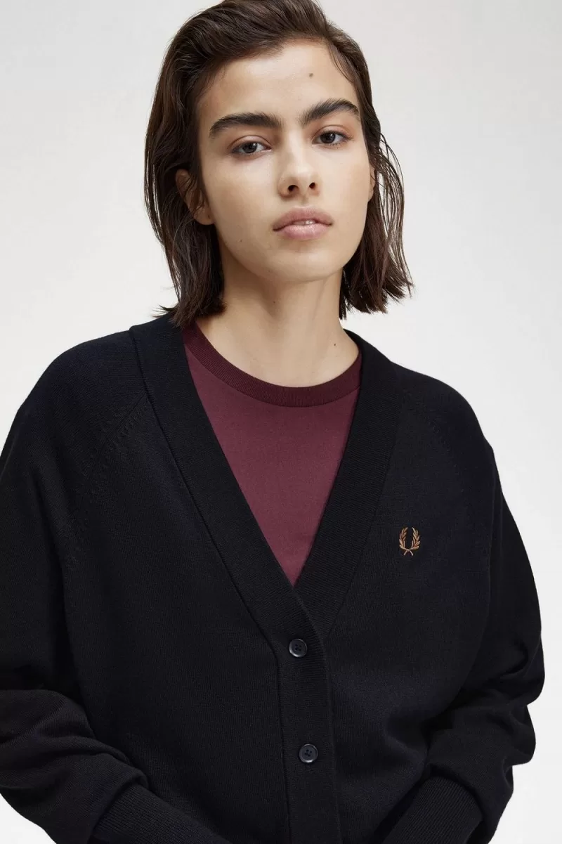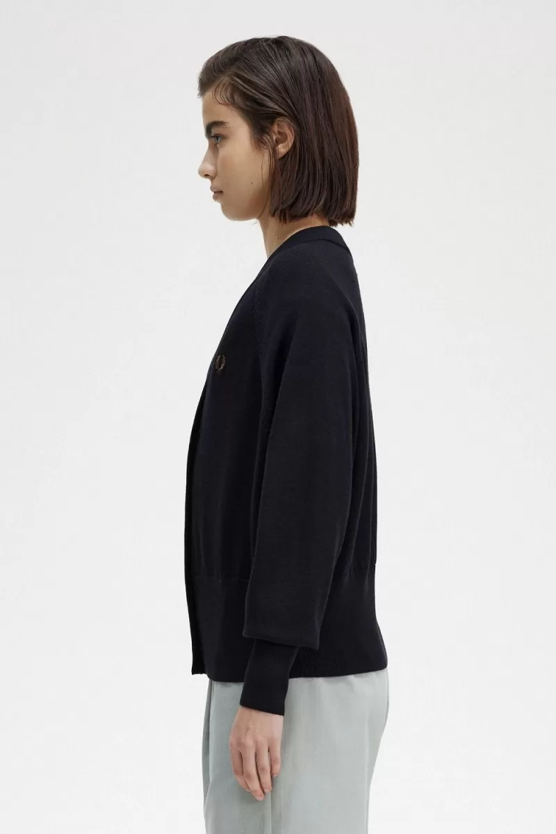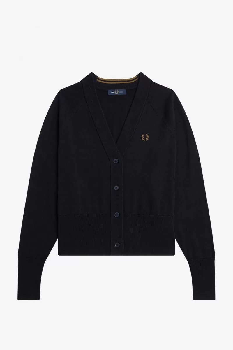 Eine Strickjacke mit V-Ausschnitt, gestrickt aus einer Mischung aus Baumwolle und Merinowolle aus ethischen Quellen.