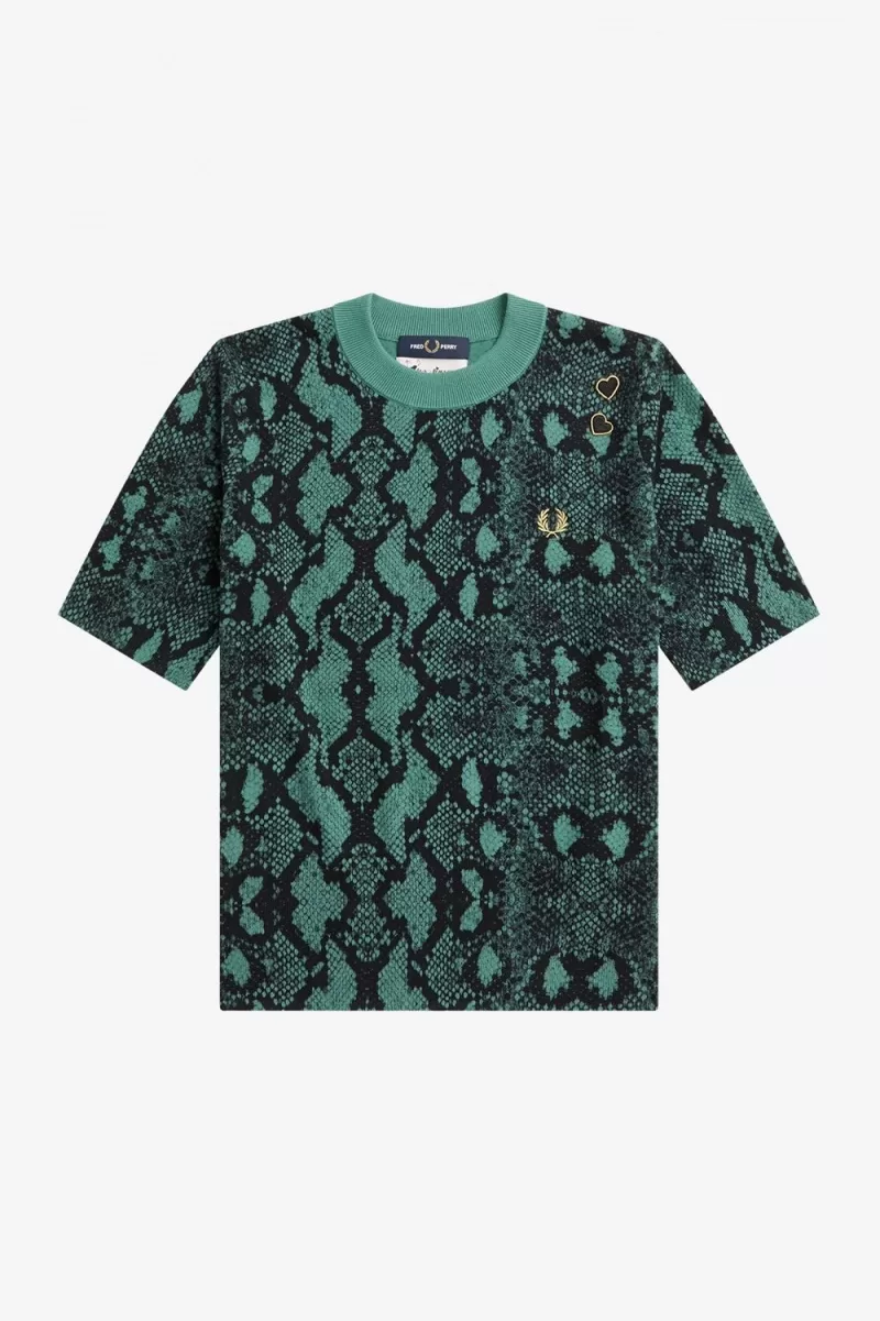 Feiner Jersey-Strickstoff / Normale Passform  / Gerippte Bündchen und Saum / Allover-Schlangenmuster / Amy gestickte Herzaufnäher über dem Lorbeer Kranz