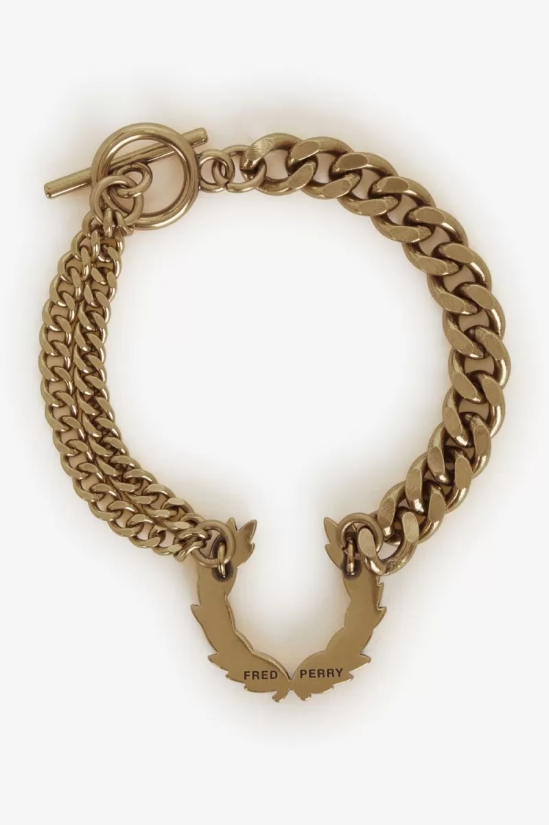 Unser klobiges, vergoldetes Armband mit einem Lorbeerkranz-Anhänger und einer Doppelkette.