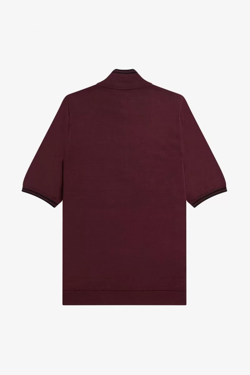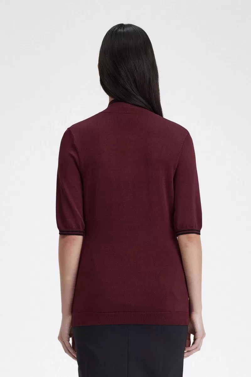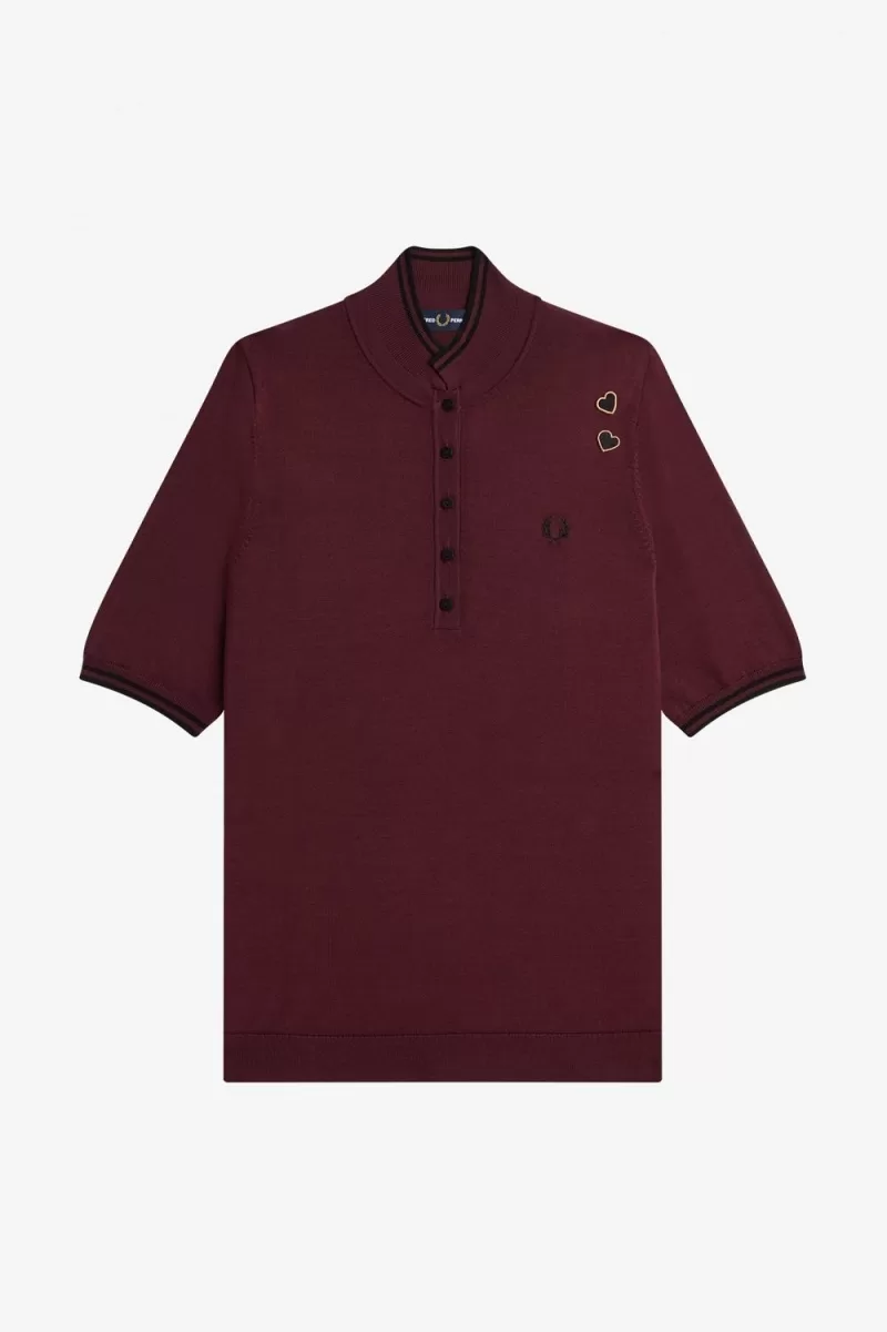 Feinfädiger recycelter Viskose-Strick / Verlängerte Knopfleiste / Stehkragen und Manschetten mit Doppelstreifen / Geformte Taille / Gestickte Herzaufnäher und Lorbeerkranz auf der linken Brust