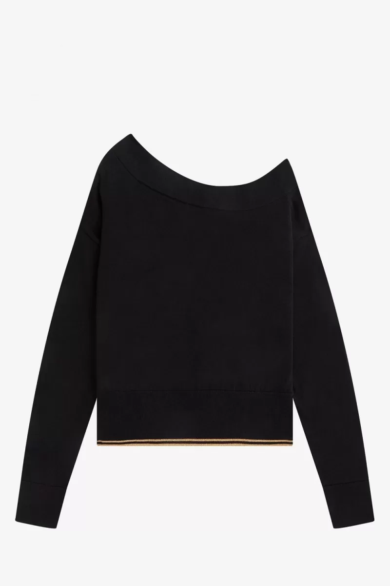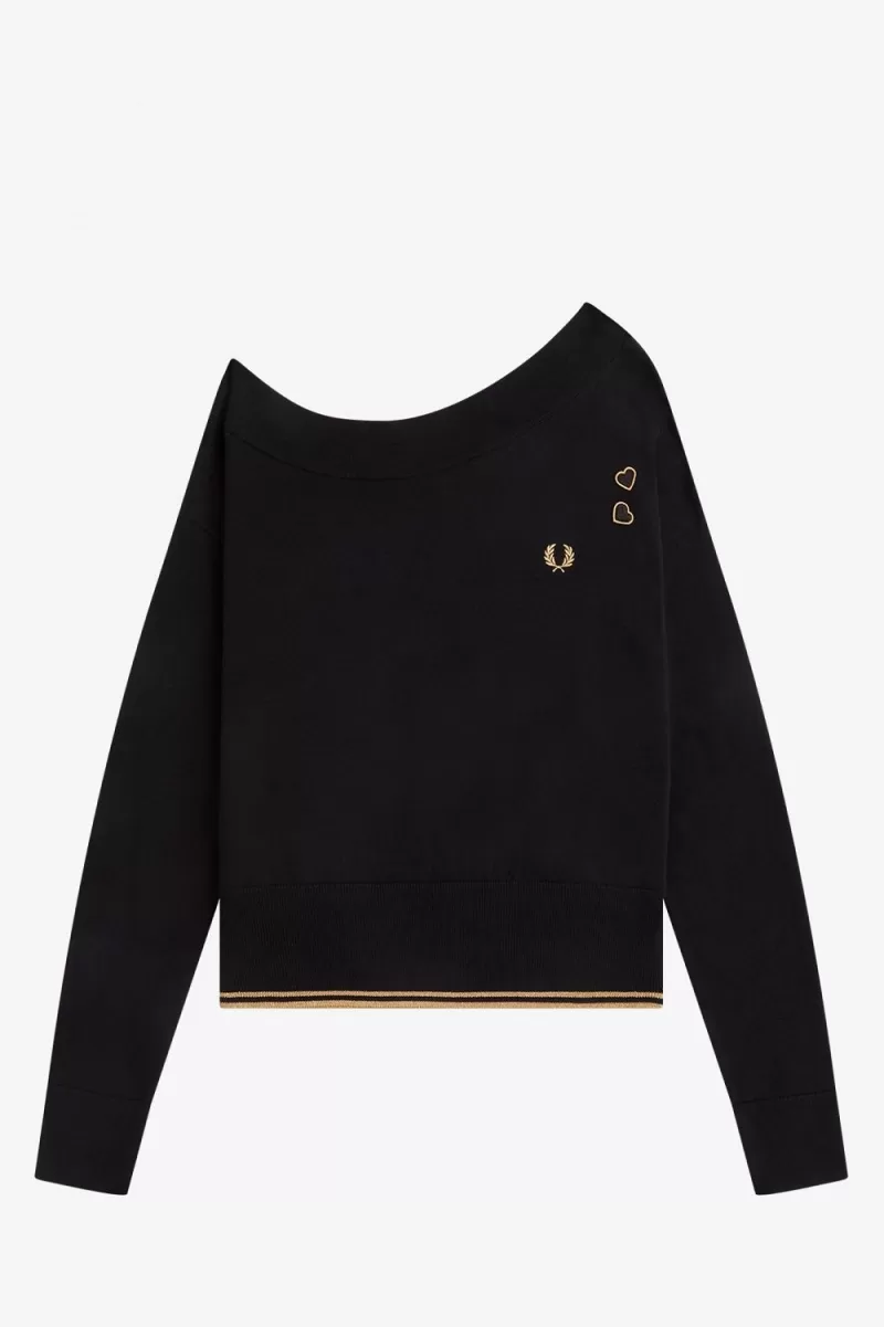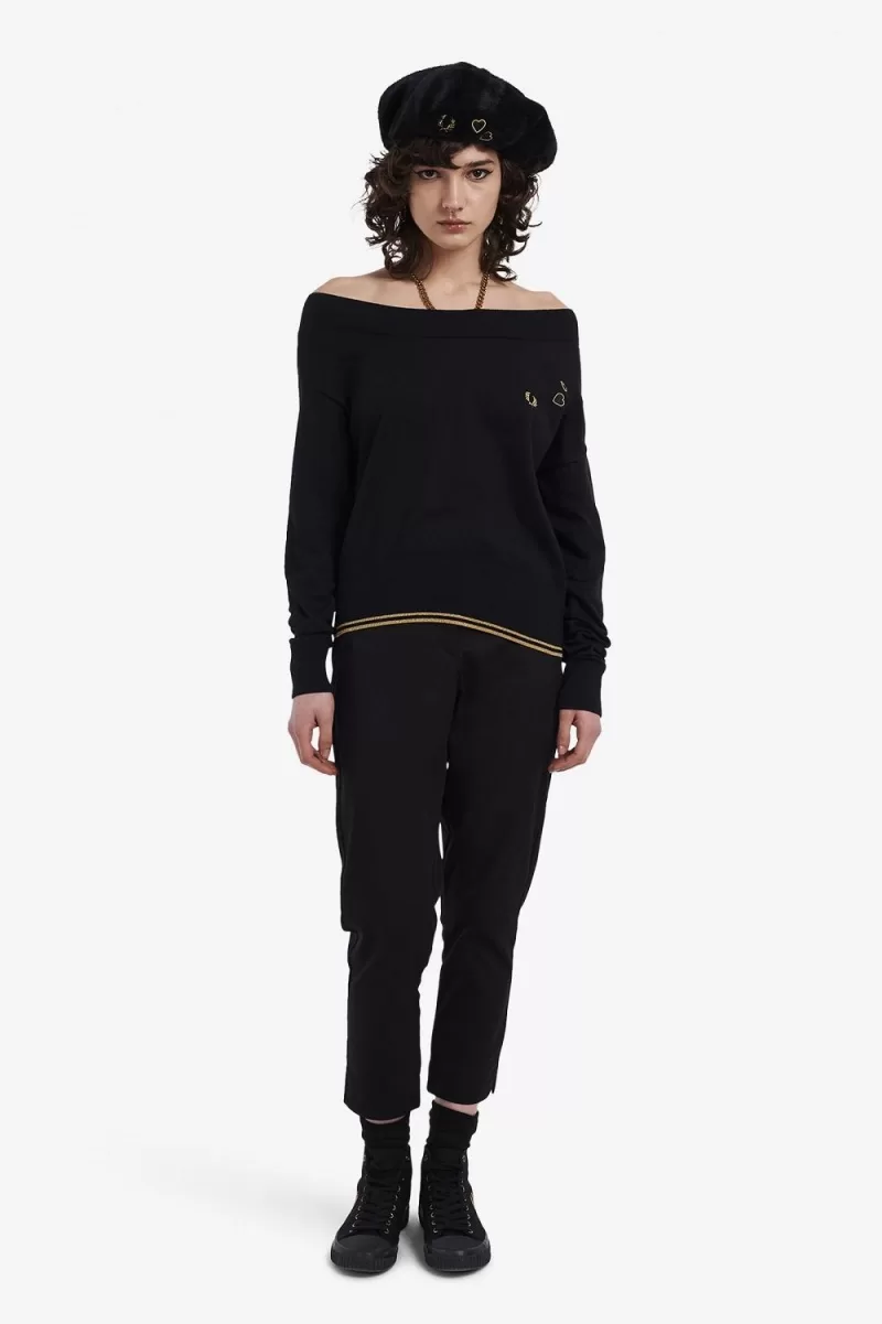 Unser schulterfreies Oberteil ist eine Anspielung auf Amys Originaldesigns für uns und basiert auf dem unverwechselbaren Pin-up-Stil der Sängerin. Es ist aus Baumwolljersey-Strick gefertigt und zeigt Amys charakteristische Liebesherzen über dem Lorbeerkranz.