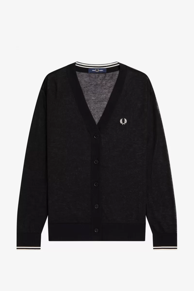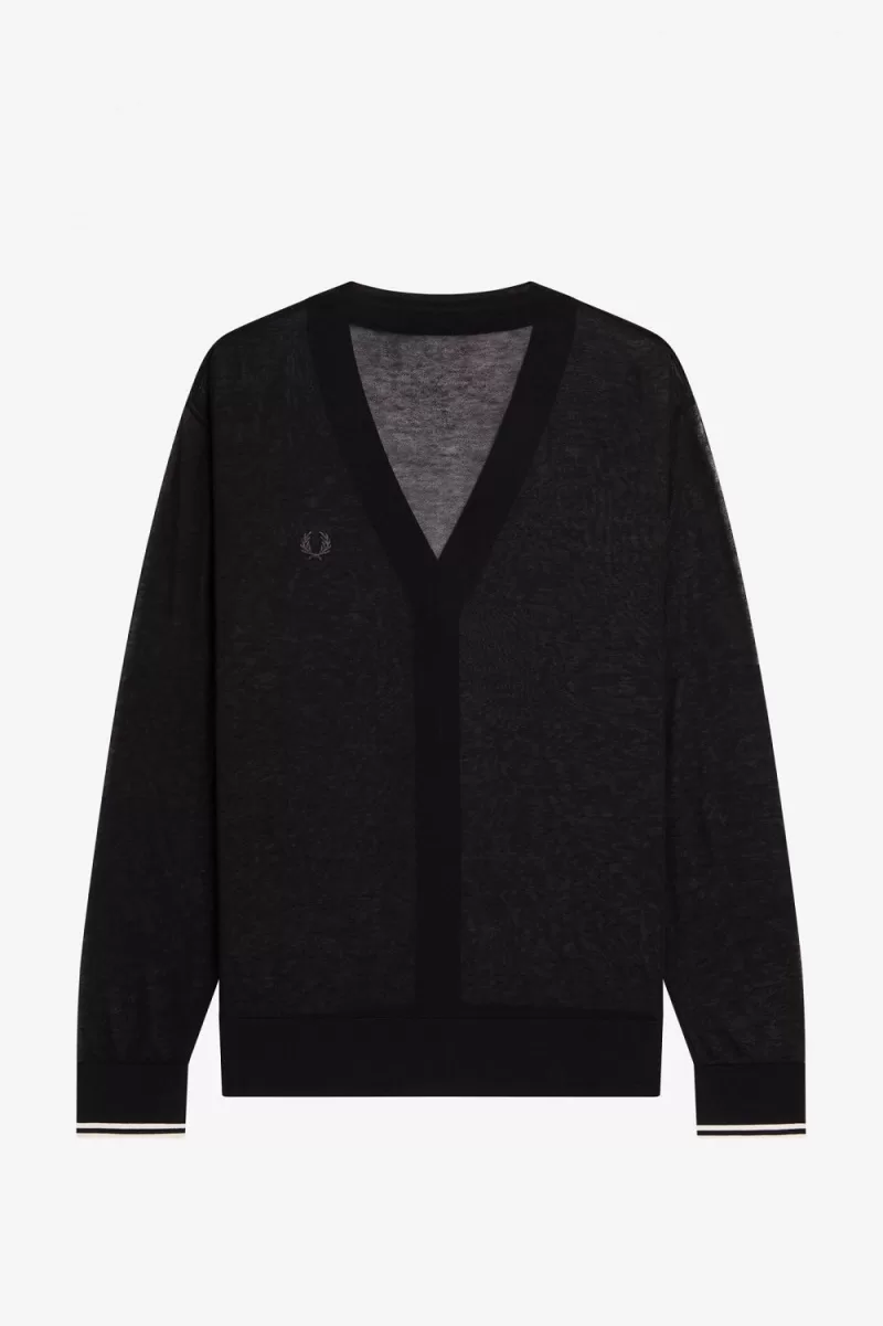 Eine entspannte Strickjacke aus transparentem Garn in zeitlosem Monochrom.