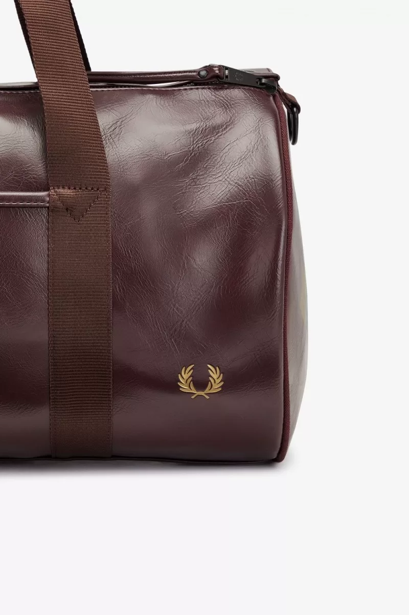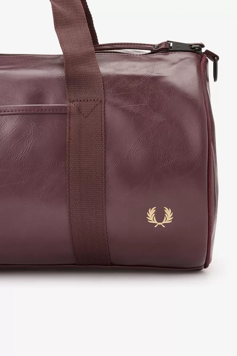 Die klassische Fred Perry-Barrel-Tasche aus strapazierfähigem PU mit farblich abgestimmten Details. Ausgestattet mit stabilen Gurtbandgriffen, einem Reißverschlussfach an einem Ende und charakteristischem Bogen-Branding.
