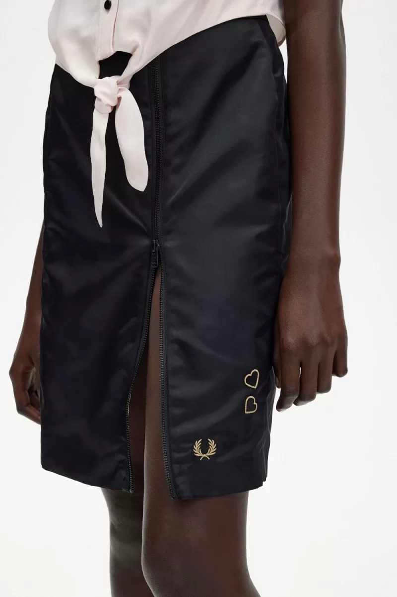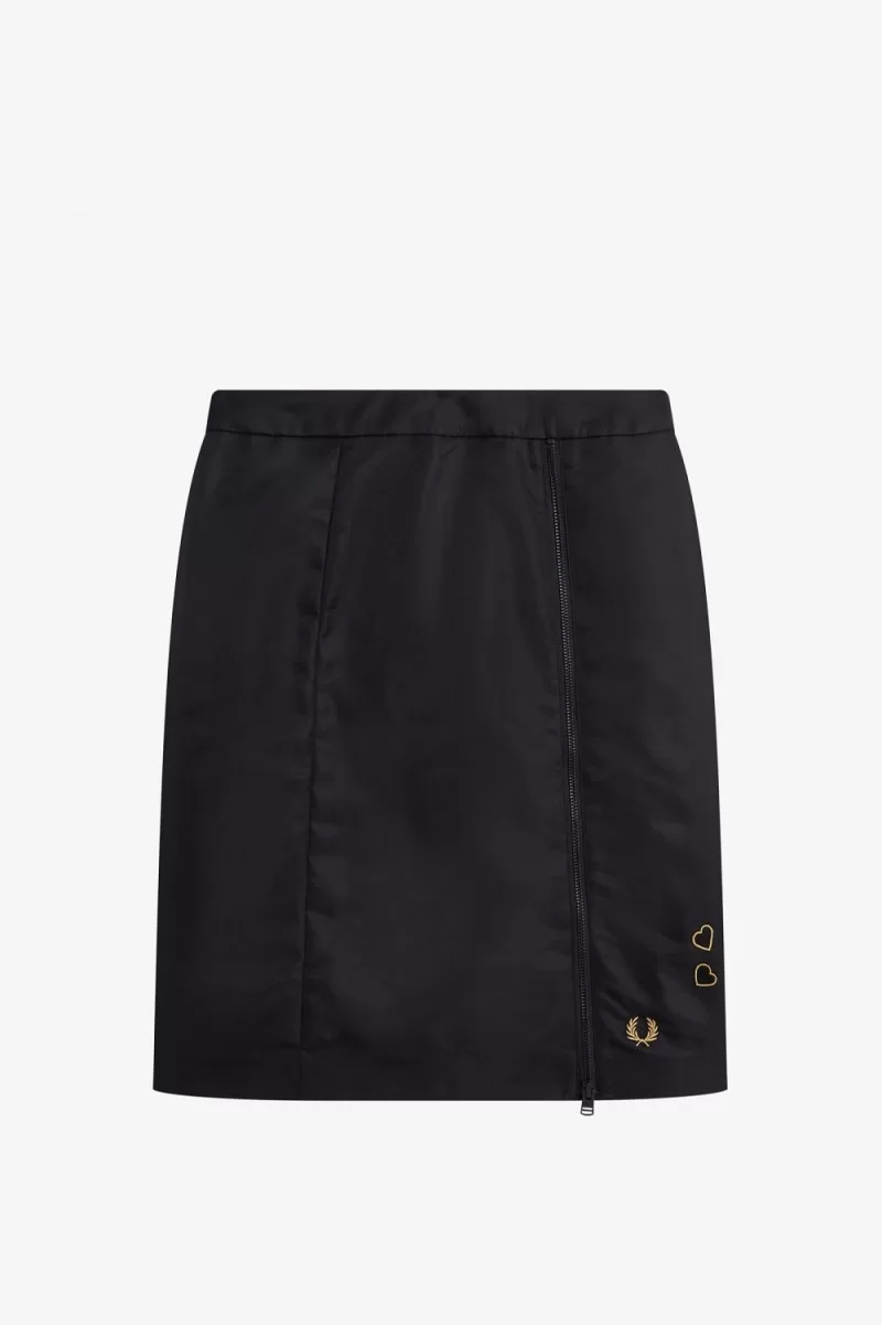 Unser Rock mit Reißverschlussdetails ist eine Anspielung auf Amys Originalentwürfe für uns und von einem Stil inspiriert, den Amy oft auf der Bühne trug. Er ist mit unseren charakteristischen gestickten Liebesherzen versehen, die von Amys Tattoos inspiriert sind.