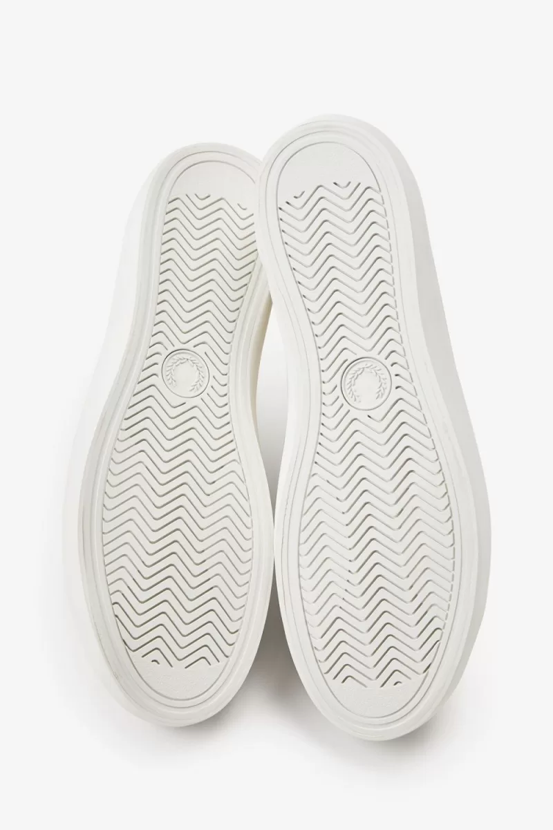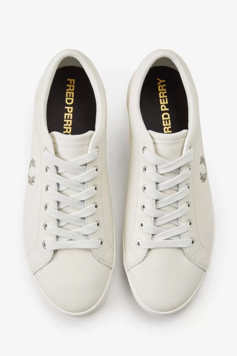 Unser Baseline-Tennisschuh aus Leder, versehen mit unserem charakteristischen Doppelstreifen und einem gestickten Lorbeerkranz auf der Viertelbahn.