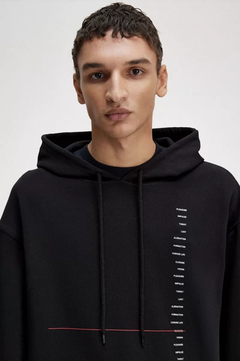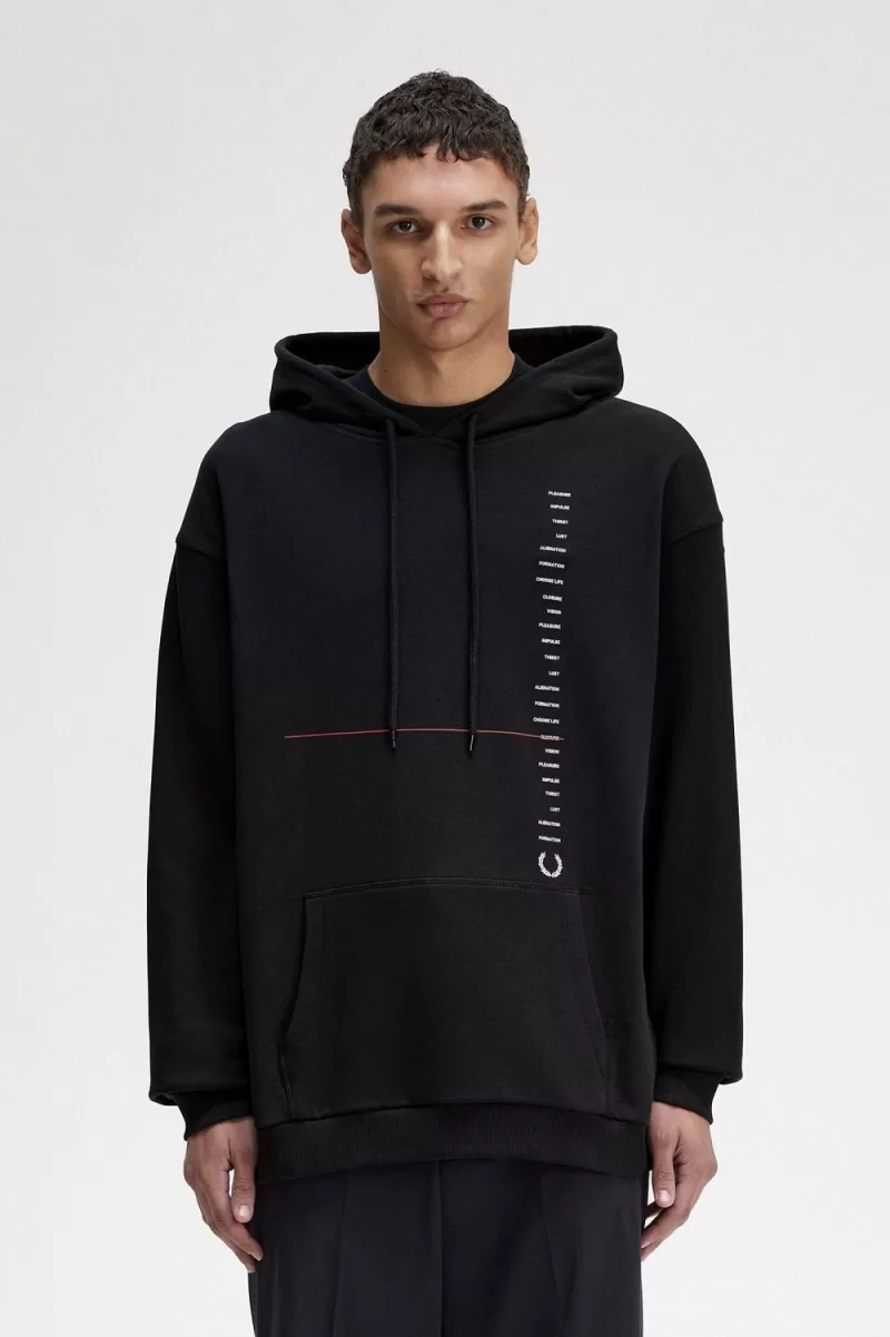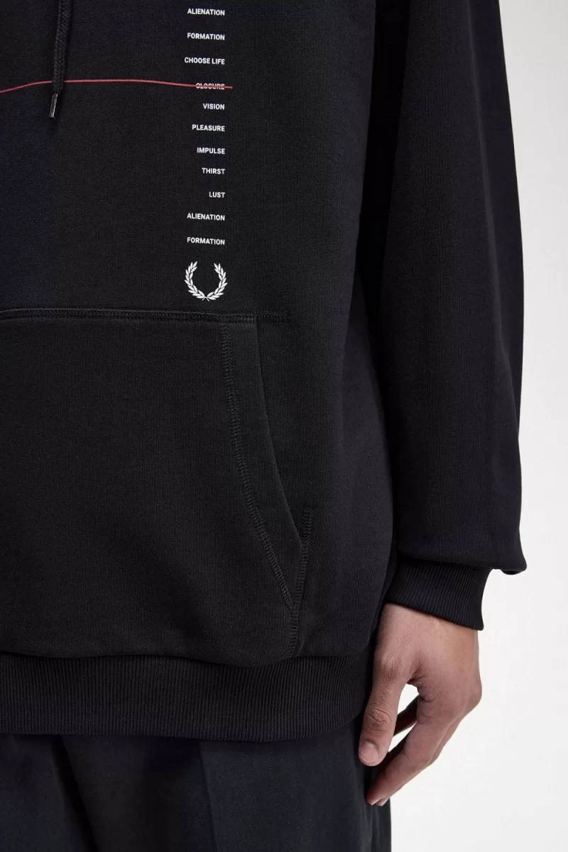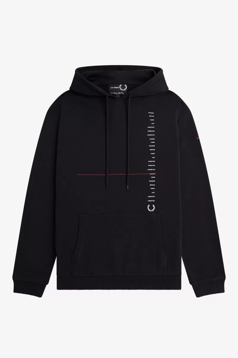 Wir stellen stolz den letzten Teil vor unserer letzten Zusammenarbeit mit Raf Simons. Als einer der berühmtesten Designer der modernen Geschichte lässt sich Simons von den späten 80ern und frühen 90ern inspirieren. Eine Zeit, in der die Arbeiterklasse in Großbritannien hart war, aber Gemeinschaften von Menschen zusammenkamen und sich in Musik, Mode und Freundschaft vereinten. Simons‘ bedrucktes Sweatshirt spiegelt seine lebenslange Beschäftigung mit der britischen Gegenkultur wider und ist mit kleinen Worten verziert, die einen starken Eindruck hinterlassen: Entfremdung, Impuls, Vision, Lust … Mit einer Kängurutasche, einer Kapuze mit Kordelzug und der übergroßen, überschnittenen Schulterpassform charakterisiert Rafs von den 90ern inspiriertes Styling. Echter britischer Mut.