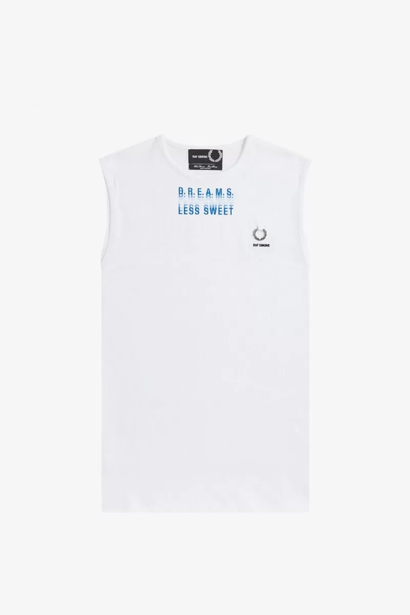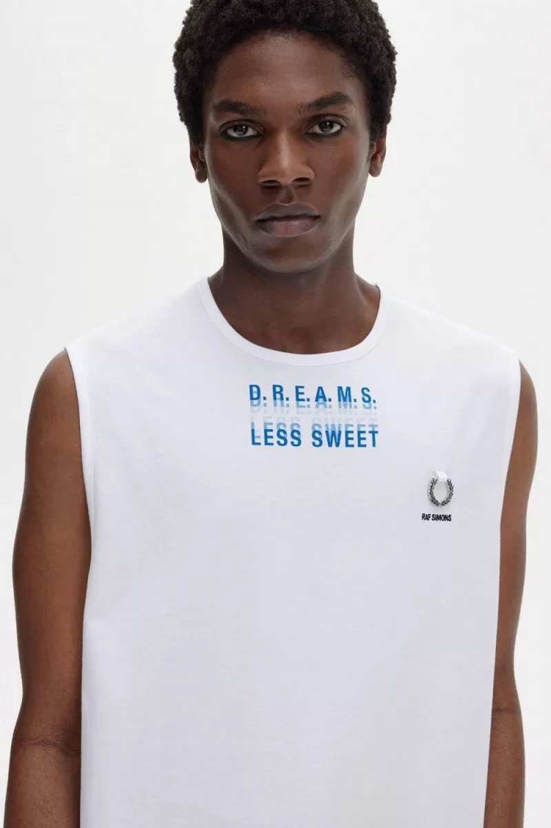 Wir arbeiten mit Raf Simons an einer locker sitzenden Weste mit einer Grafik auf der Vorderseite, einem silbernen Lorbeerkranz aus Metall und einer Raf-Simons-Stickerei.
