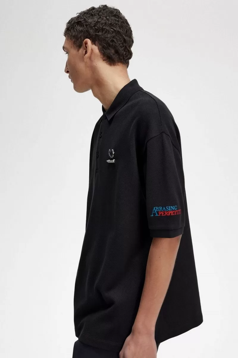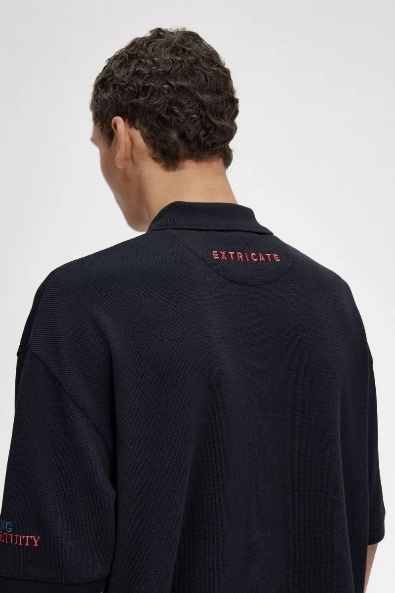 Ein übergroßes Poloshirt aus schwerem Baumwollpiqué, entworfen in Zusammenarbeit mit Raf Simons. Mit gestickten Details und Emaille-Nadeln auf der Brust.