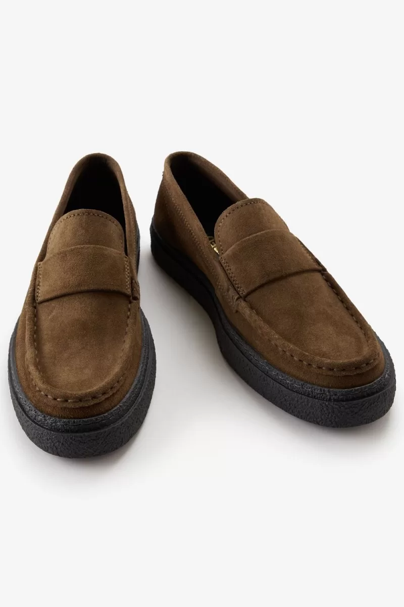 Ein schicker Wildleder-Loafer mit einer Außensohle mit Kreppeffekt, der zum Ausgehen gemacht ist.
