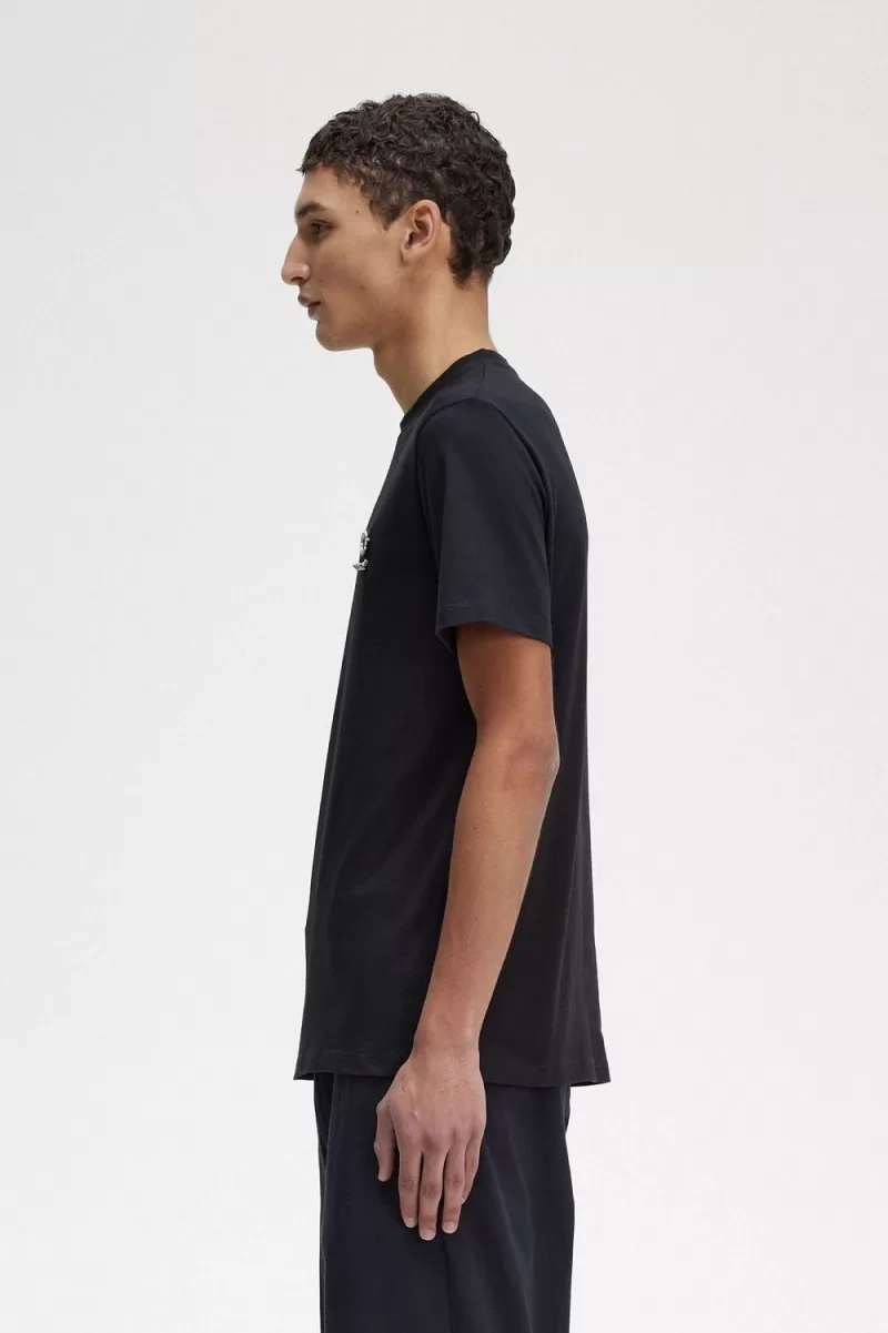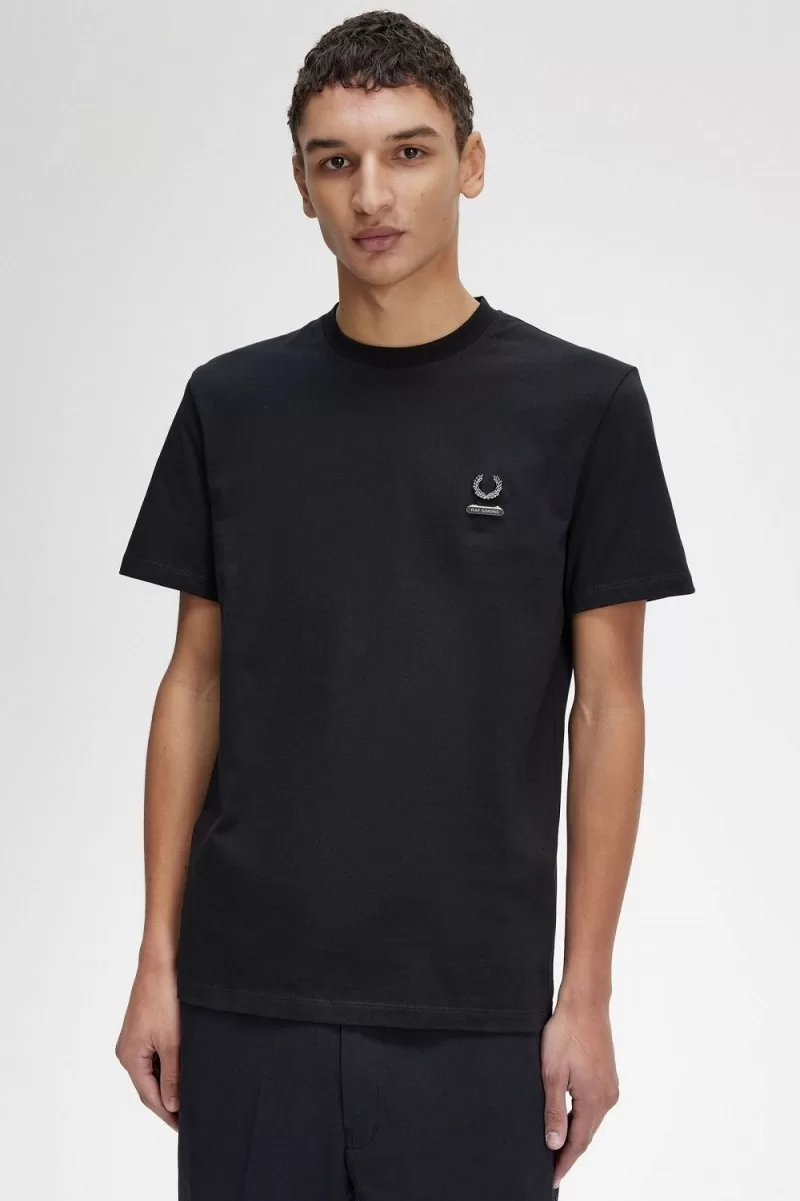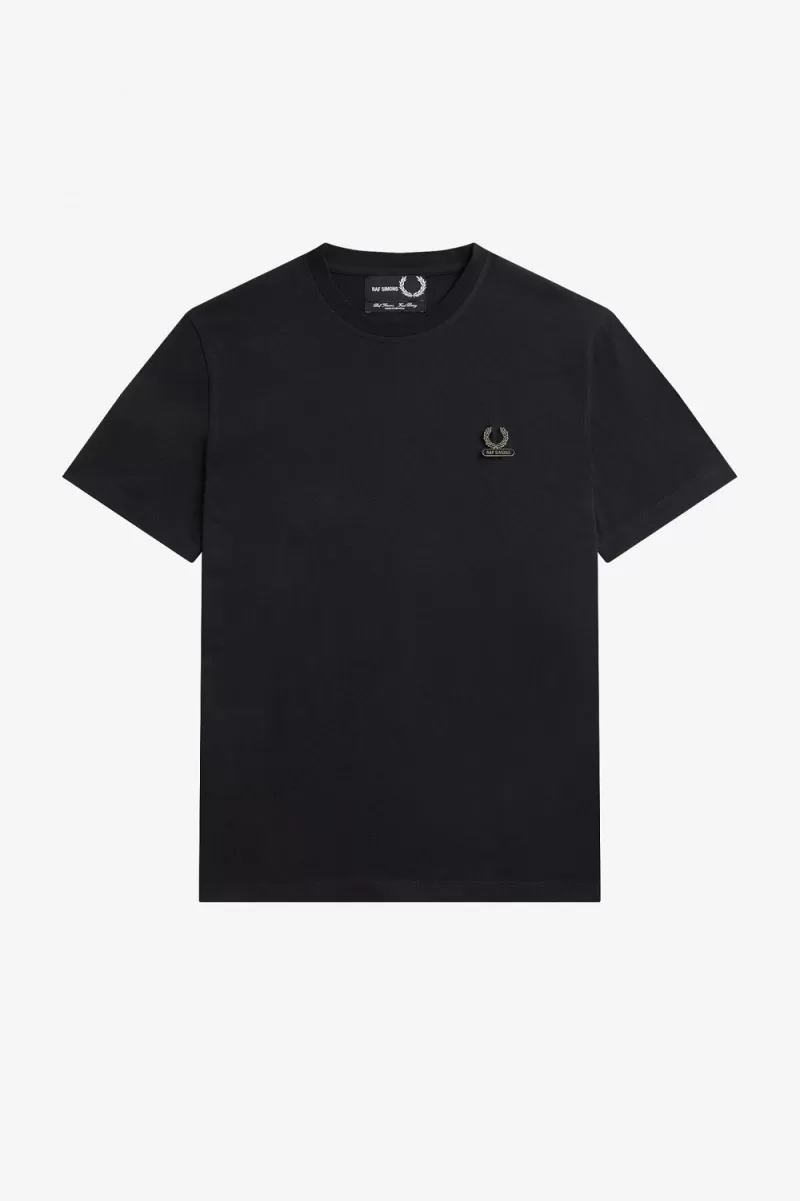 Ein T-Shirt aus Baumwolljersey mit Rundhalsausschnitt, schmucklos bis auf die Emaille-Anstecker von Laurel Wreath und Raf Simons auf der Brust.