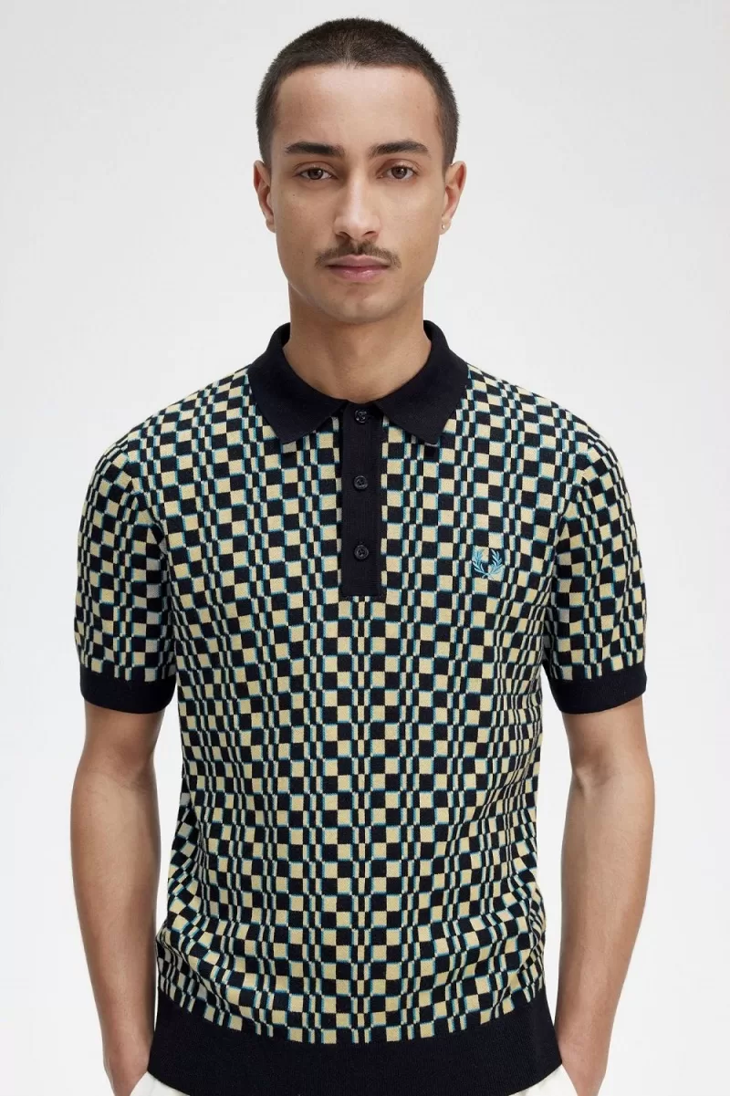 Unsere Glitch-Print-Designs beziehen sich auf Bildschirme und Schallwellen von die Rave- und Techno-Szene der 90er Jahre, als kräftige Farben und abstrakte Formen sich an der bunten Sportbekleidung orientierten, die im europäischen Tenniszirkus auftauchte. Unser Glitch-Schachbrett-Strickhemd ist mit der charakteristischen Laurel Wreath-Stickerei auf der Brust versehen. Unverkennbar Fred Perry.