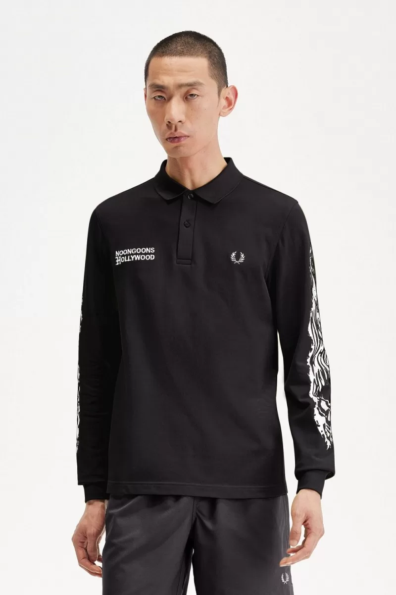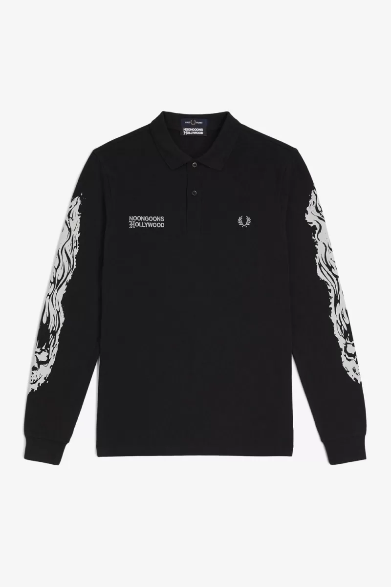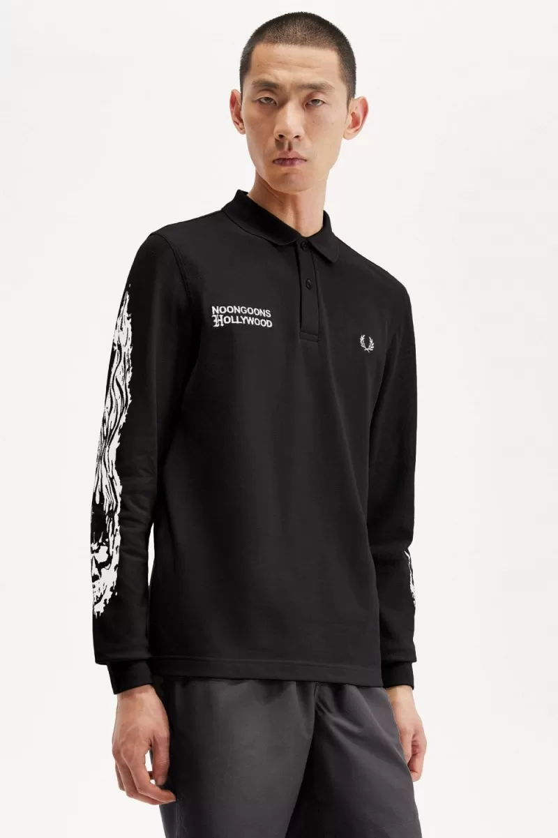 L.A. Die Marke Noon Goons hat dem Fred Perry Shirt ihren Stempel aufgedrückt und sich dabei vom entspannten Surfstil der Westküste inspirieren lassen. Bedruckt mit flammenumhüllten Totenköpfen auf den Ärmeln, mit Doppelbranding-Stickerei auf der Brust.