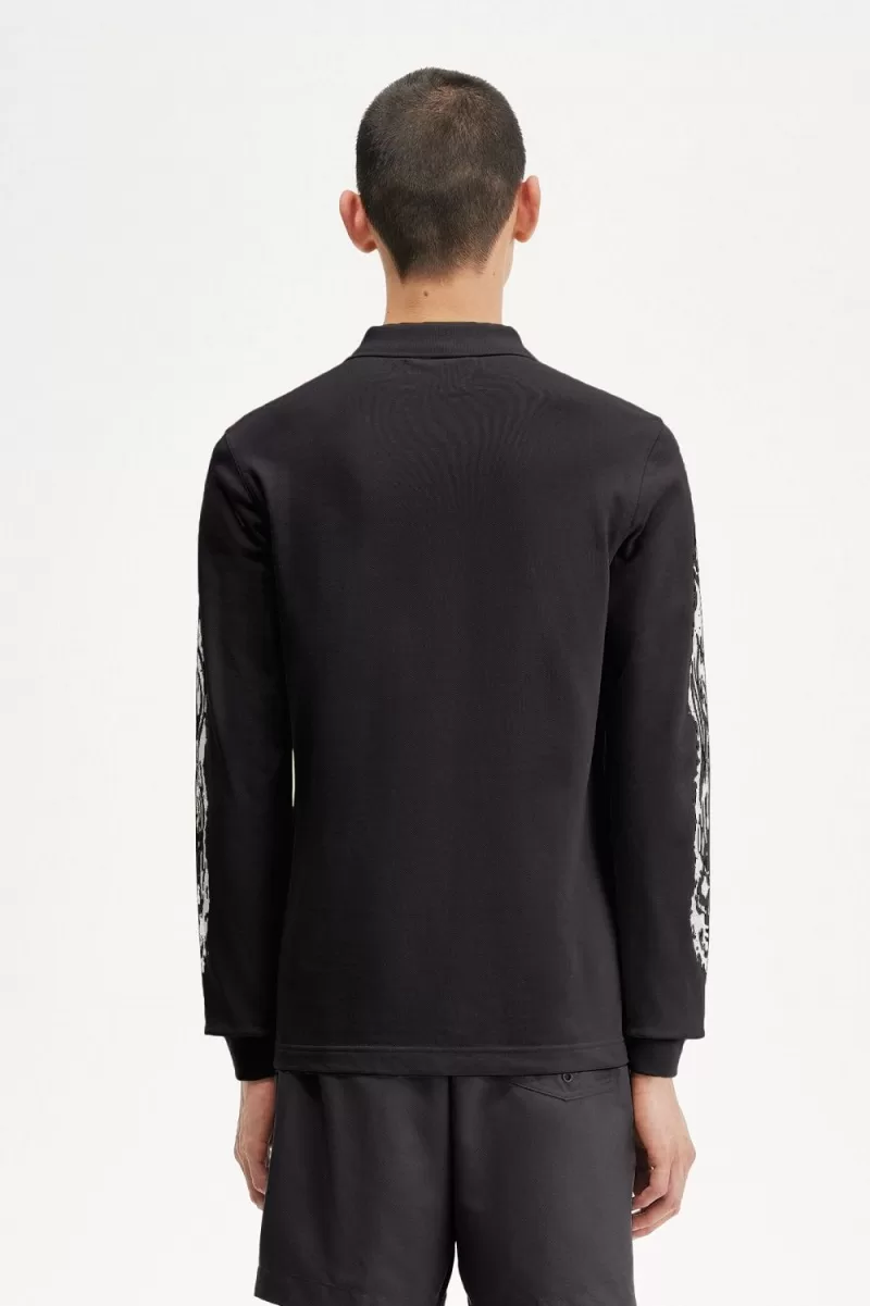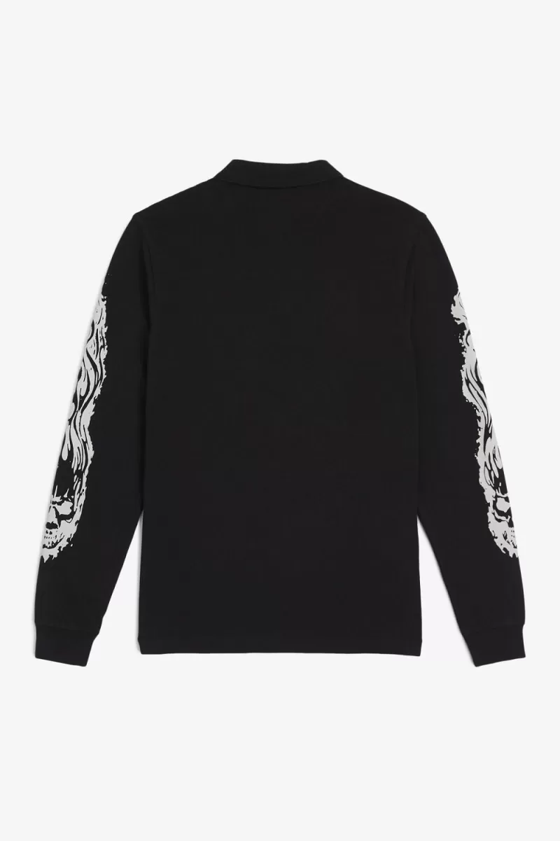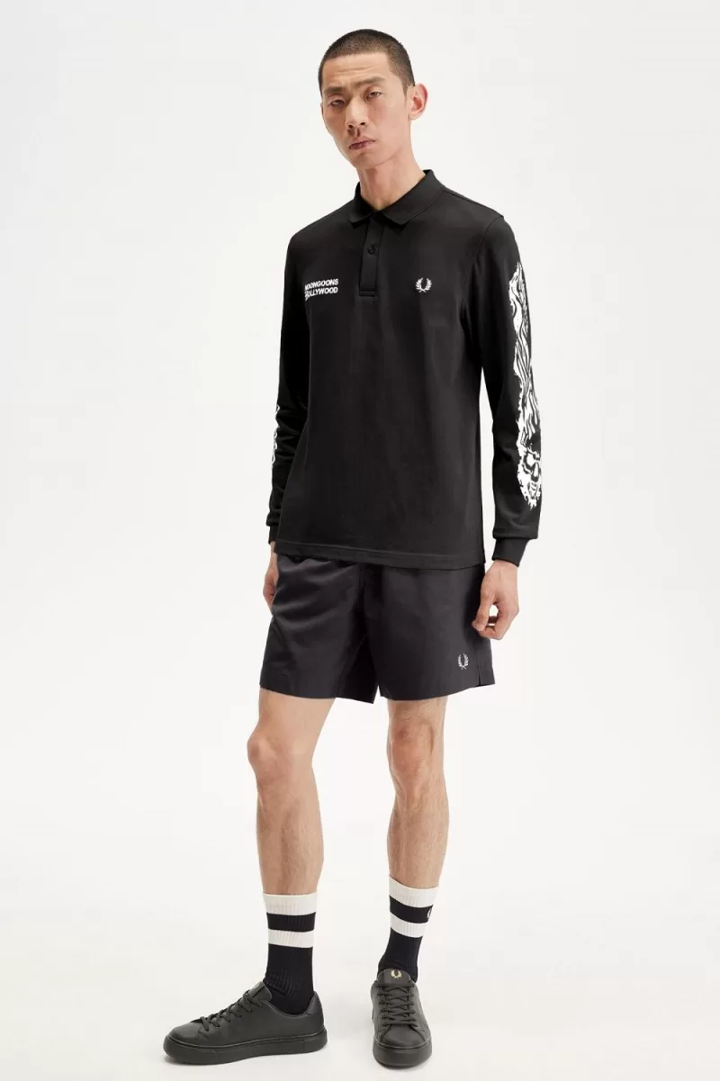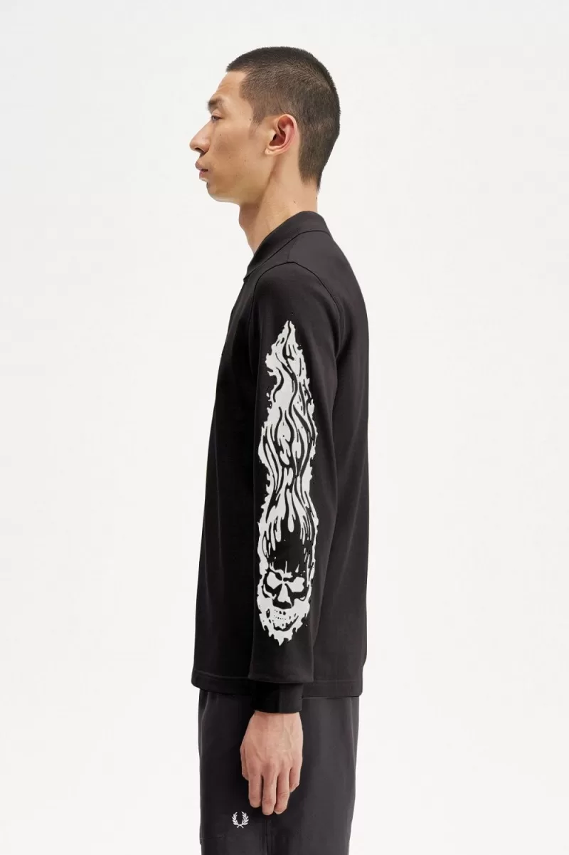 L.A. Die Marke Noon Goons hat dem Fred Perry Shirt ihren Stempel aufgedrückt und sich dabei vom entspannten Surfstil der Westküste inspirieren lassen. Bedruckt mit flammenumhüllten Totenköpfen auf den Ärmeln, mit Doppelbranding-Stickerei auf der Brust.