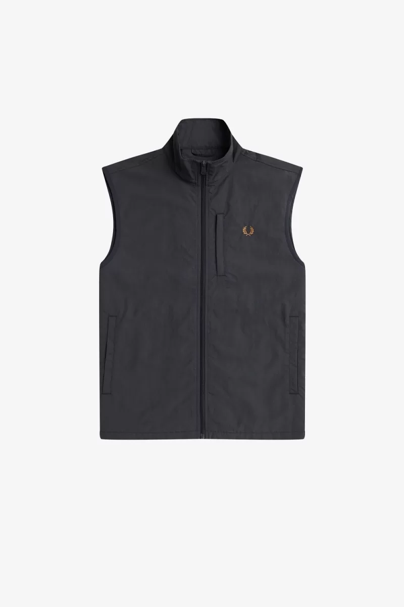 Unsere gefütterte Weste aus recyceltem Stoff mit elegantem erhöhtem Kragen und kontrastierender Einfassung.
