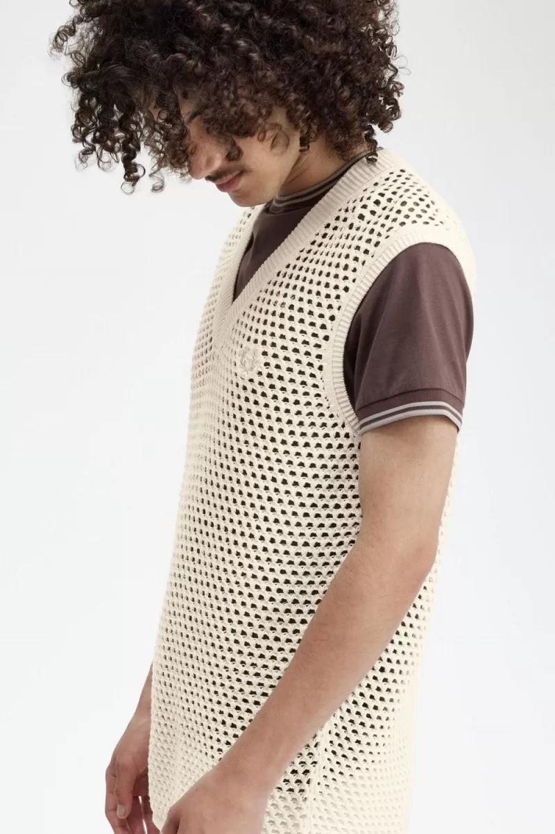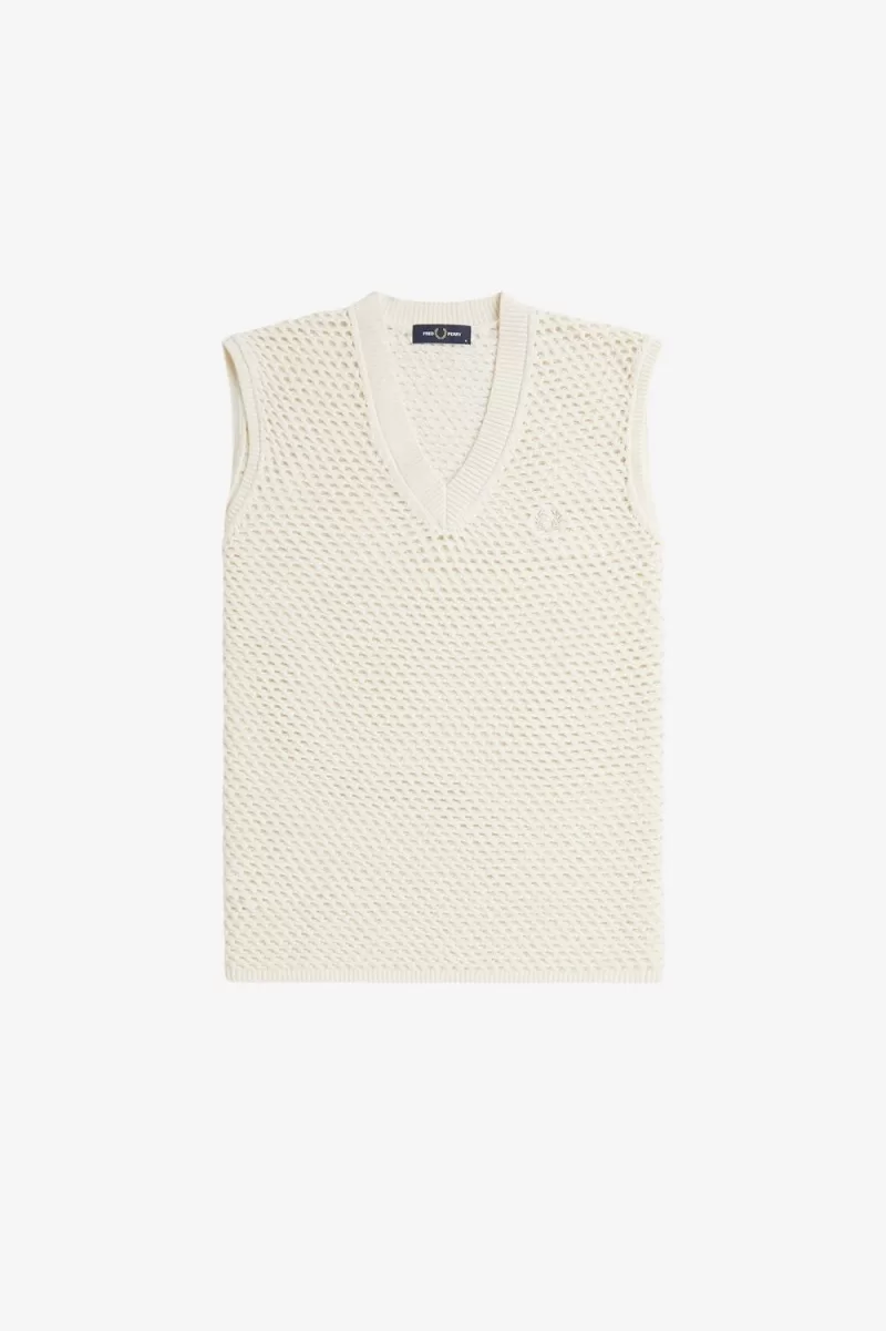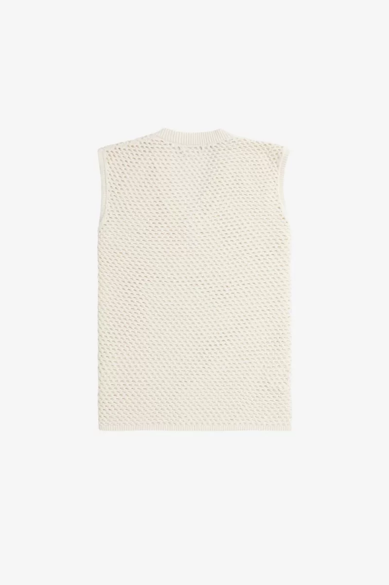 Dieses Spitzenstrick-Tanktop orientiert sich daran Die offenen Strickwaren und schlichten Jersey-Stiche der Trainingsausrüstung mit ihren luftigen Futterstoffen und perforierten Einsätzen. Mesh-Styles, die normalerweise in Basisschichten zu finden sind und darüber getragen werden, setzen ein auffälliges Statement – ein Look, der von den jamaikanischen Rude Boys entwickelt wurde, deren String-Westen zum Dancehall der 90er Jahre wurden Kleiderordnung.