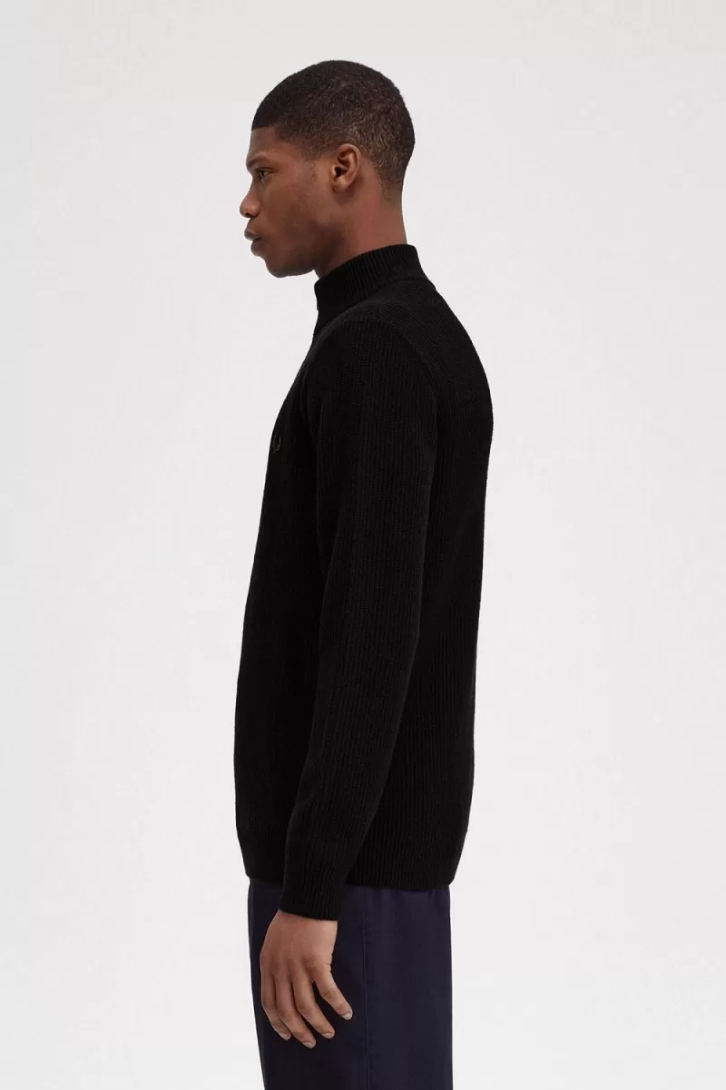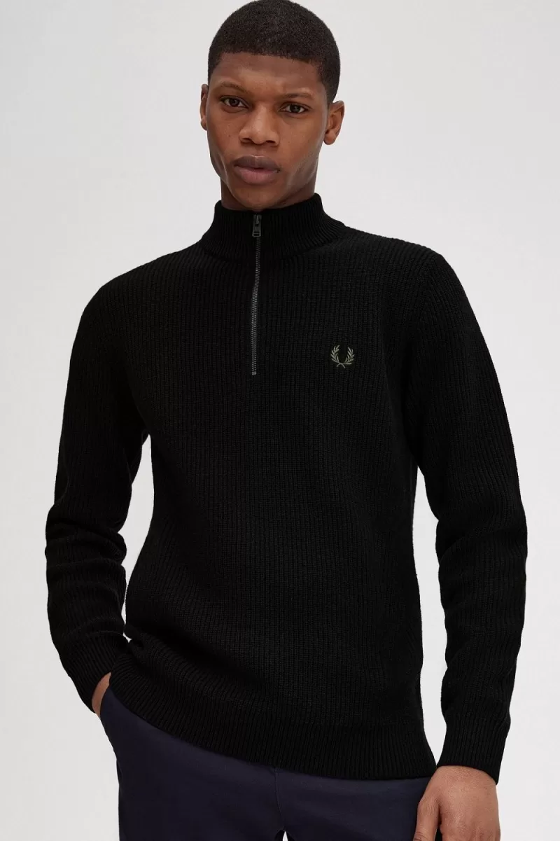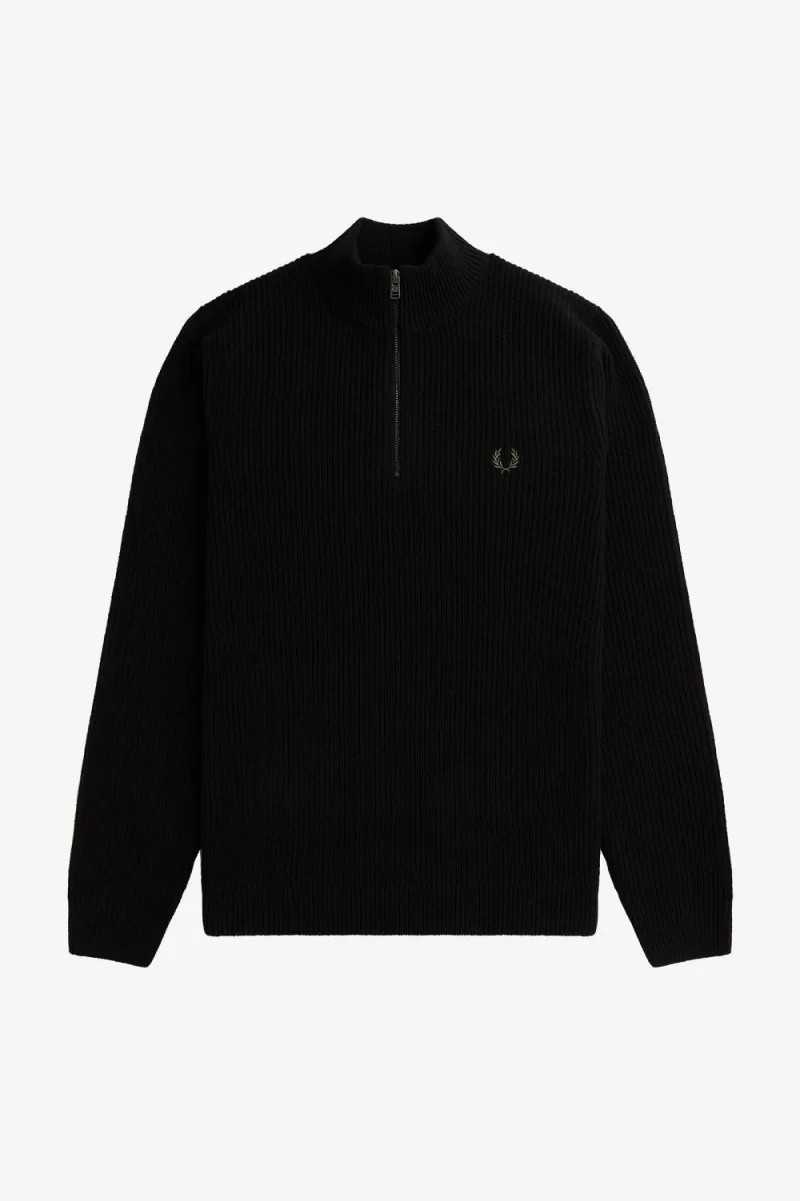 Ein gerippter Pullover mit halbem Reißverschluss, gestrickt aus reiner Lammwolle im Halbcardigan-Stich.