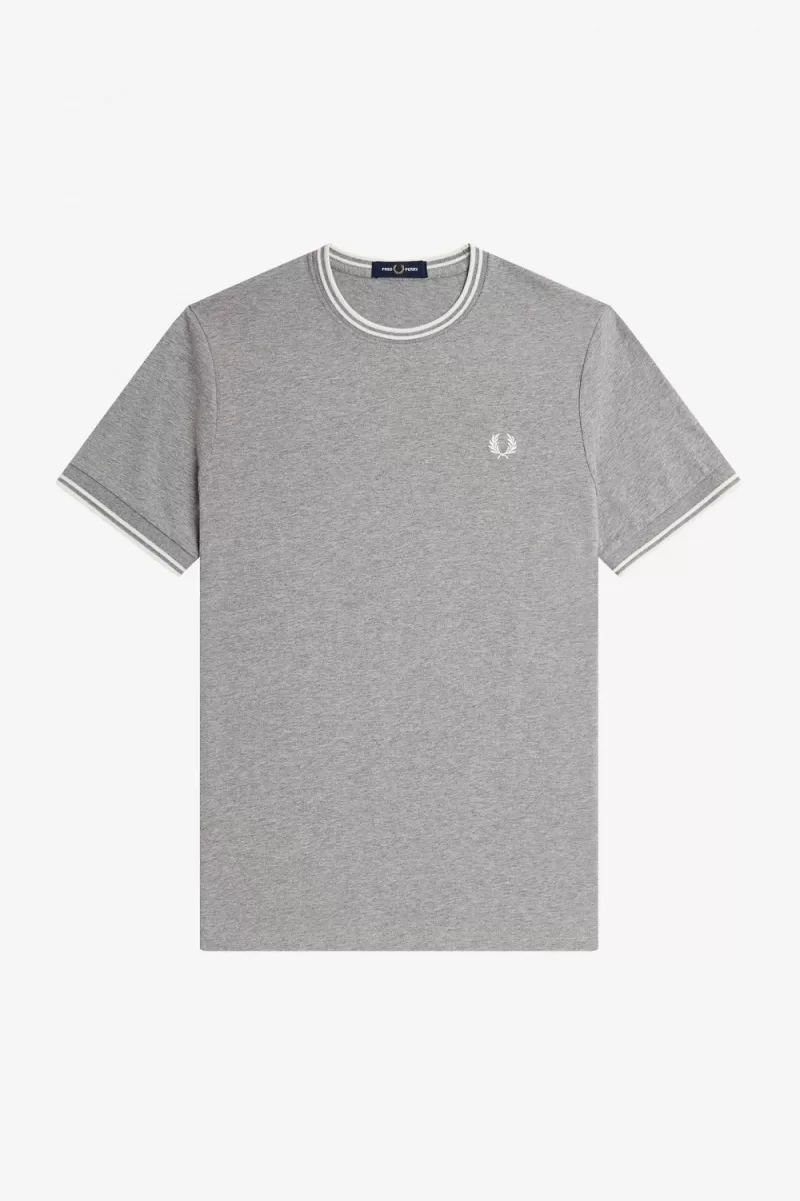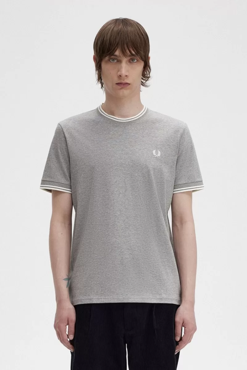 Der Legende nach kam es zu unserem Doppeltipp, als ein Käufer von Lillywhites darum bat, Freds einfarbiges Tennisshirt mit den Farben der Fußballmannschaft zu versehen. Nur wir geben Trinkgeld im Verhältnis 5-4-4 und es ist Teil unserer DNA. Unser T-Shirt mit Rundhalsausschnitt ist mit unseren charakteristischen Details gestaltet und verfügt über Doppelstreifen und eine farblich abgestimmte Lorbeerkranz-Stickerei. Sehr, sehr Fred Perry.
