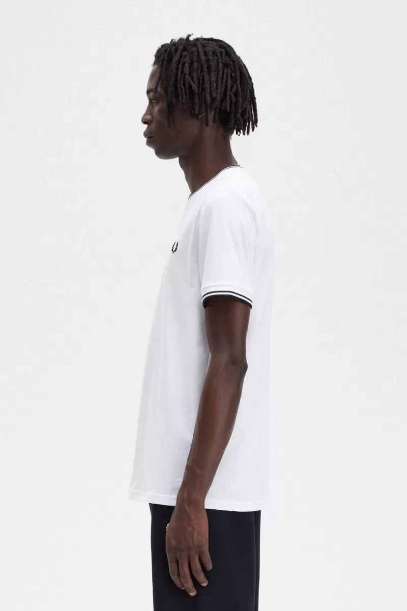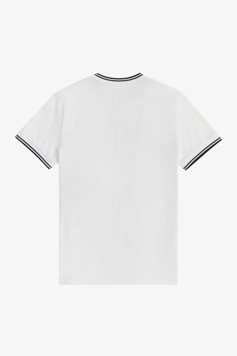 Der Legende nach kam es zu unserem Doppeltipp, als ein Käufer von Lillywhites darum bat, Freds einfarbiges Tennisshirt mit den Farben der Fußballmannschaft zu versehen. Nur wir geben Trinkgeld im Verhältnis 5-4-4 und es ist Teil unserer DNA. Unser T-Shirt mit Rundhalsausschnitt ist mit unseren charakteristischen Details gestaltet und verfügt über Doppelstreifen und eine farblich abgestimmte Lorbeerkranz-Stickerei. Sehr, sehr Fred Perry.