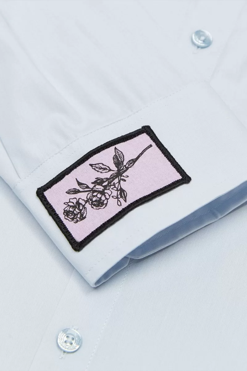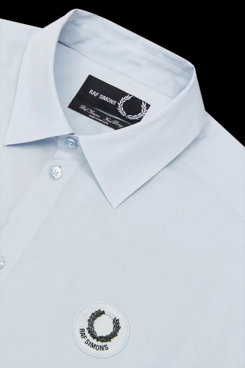 Wir arbeiten mit Raf Simons an einem übergroßen Hemd aus edler Baumwollpopeline, hergestellt in Portugal. Entworfen mit maßgeschneiderten gestickten Aufnähern und abgerundet mit einer Lorbeerkranz- und Raf-Simons-Stickerei aus Metall auf der Brust.
