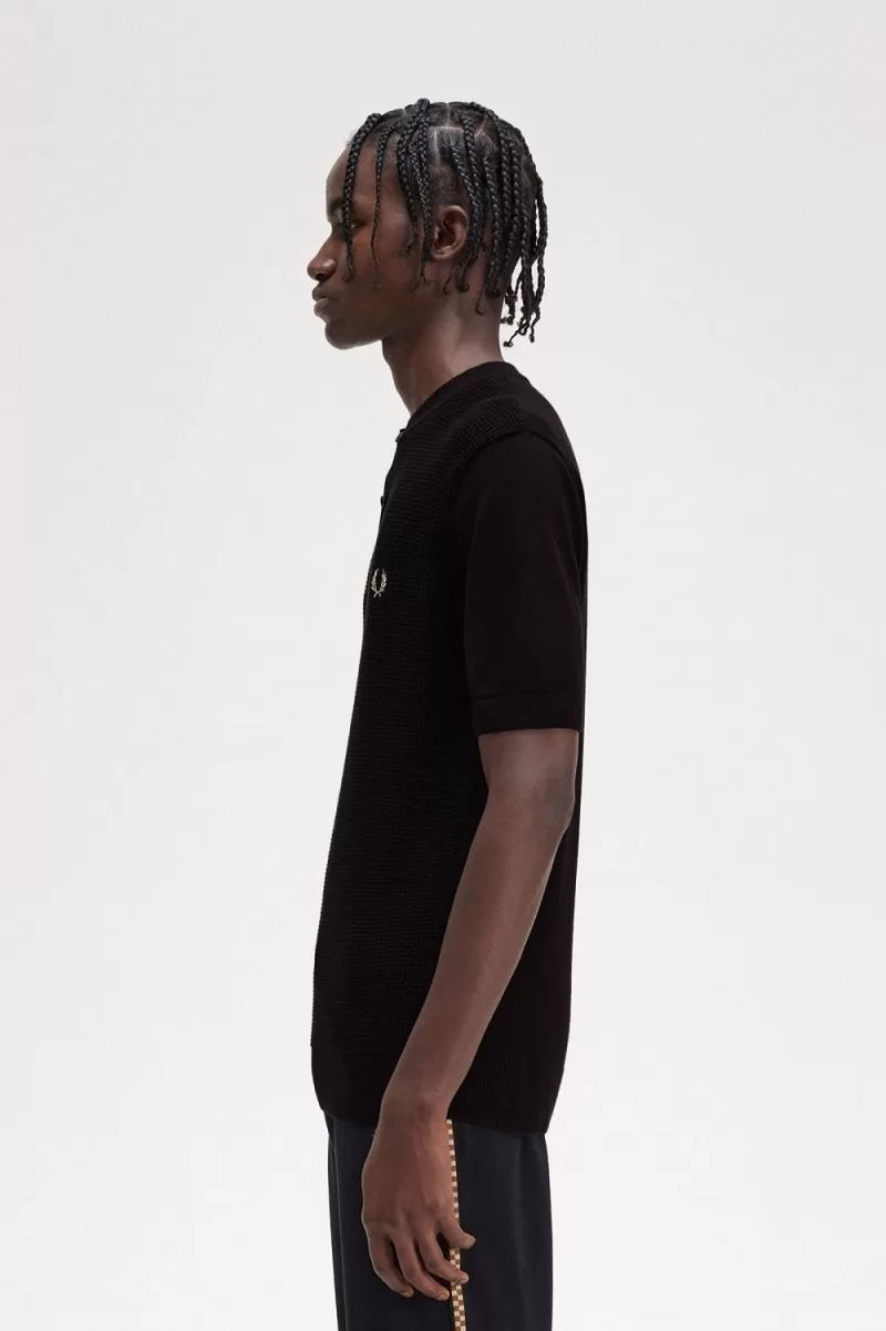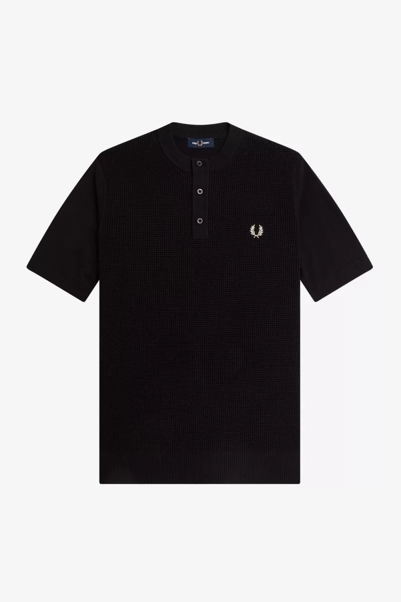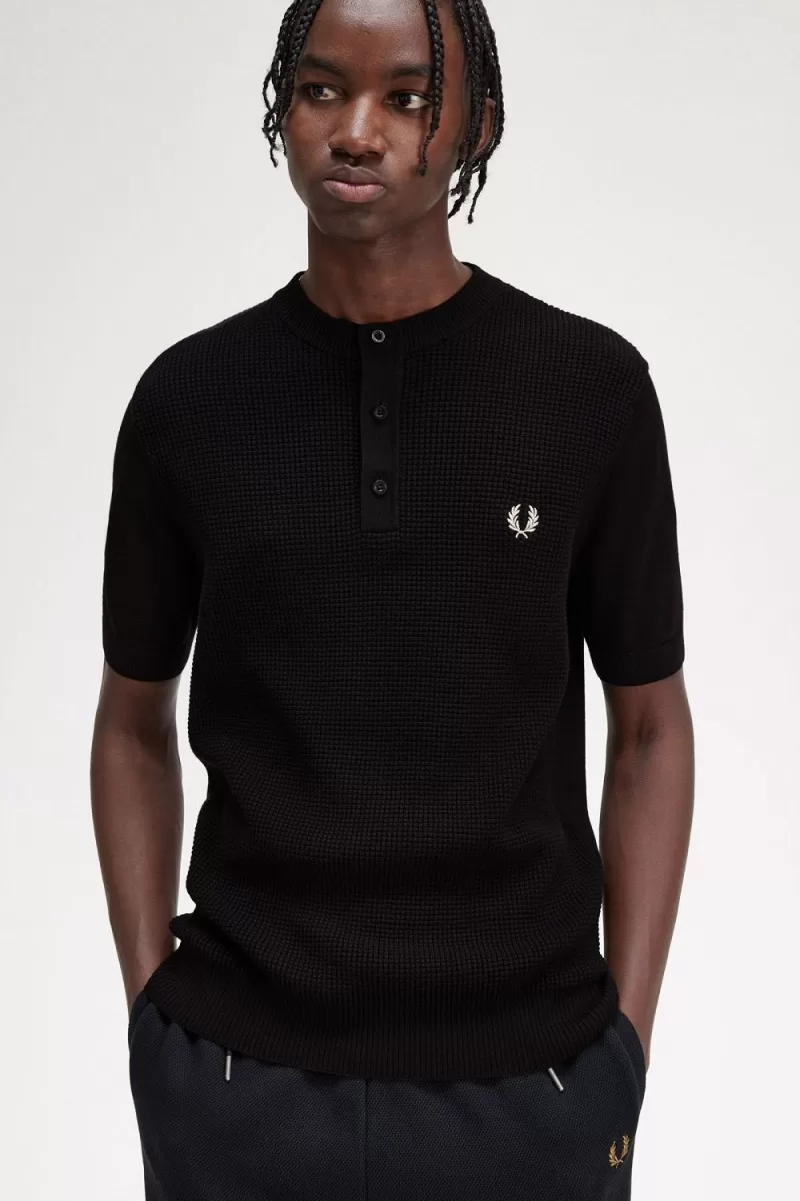 Waffle Stitch Henley Herrenhemd Schwarz