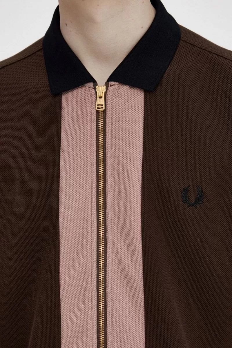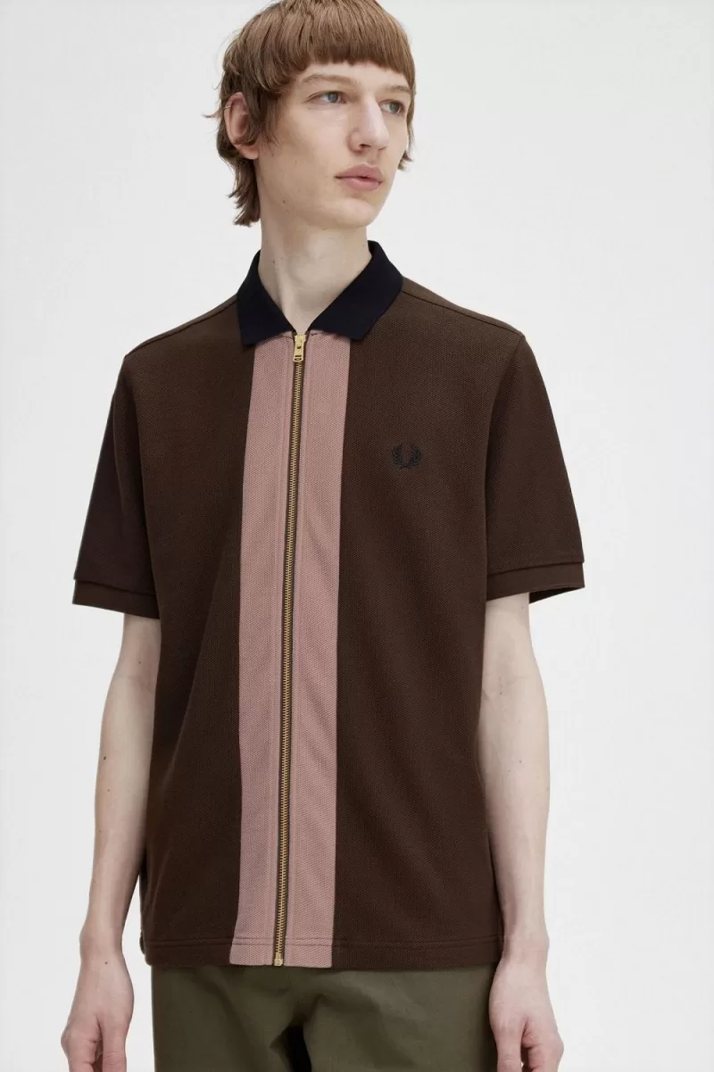 Unser Poloshirt aus wabenförmigem Baumwollpiqué mit kontrastierenden Cut-and-Sew-Einsätzen und einem durchgehenden goldfarbenen Reißverschluss.
